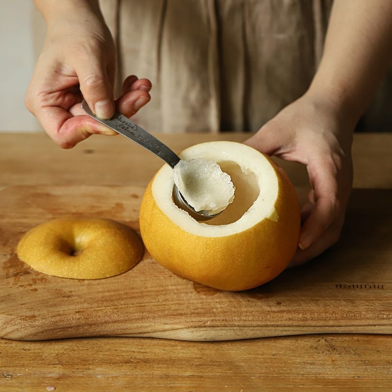 Wash the pear, cut off the top, and hollow it out. Blend half of the scooped pear to make juice.
