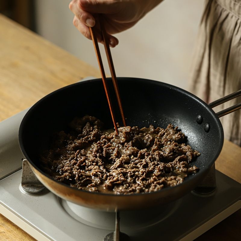 Lightly oil a heated pan and stir-fry the marinated beef until cooked.