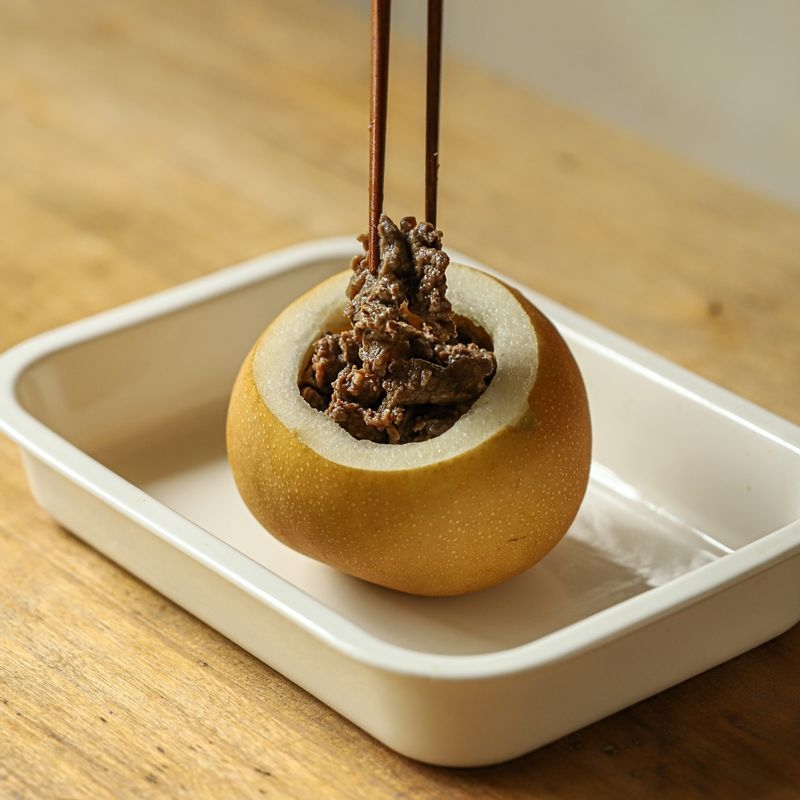 Steamed bulgogi in pear is a refined Korean dish where savory marinated beef is stir-fried, then steamed inside a hollowed Korean pear. Enhanced with honey, garlic, doraji, and jujube, the dish balances sweet, earthy, and umami flavors. Pear juice tenderizes the beef, creating a tender, aromatic, and elegant seasonal entrée.