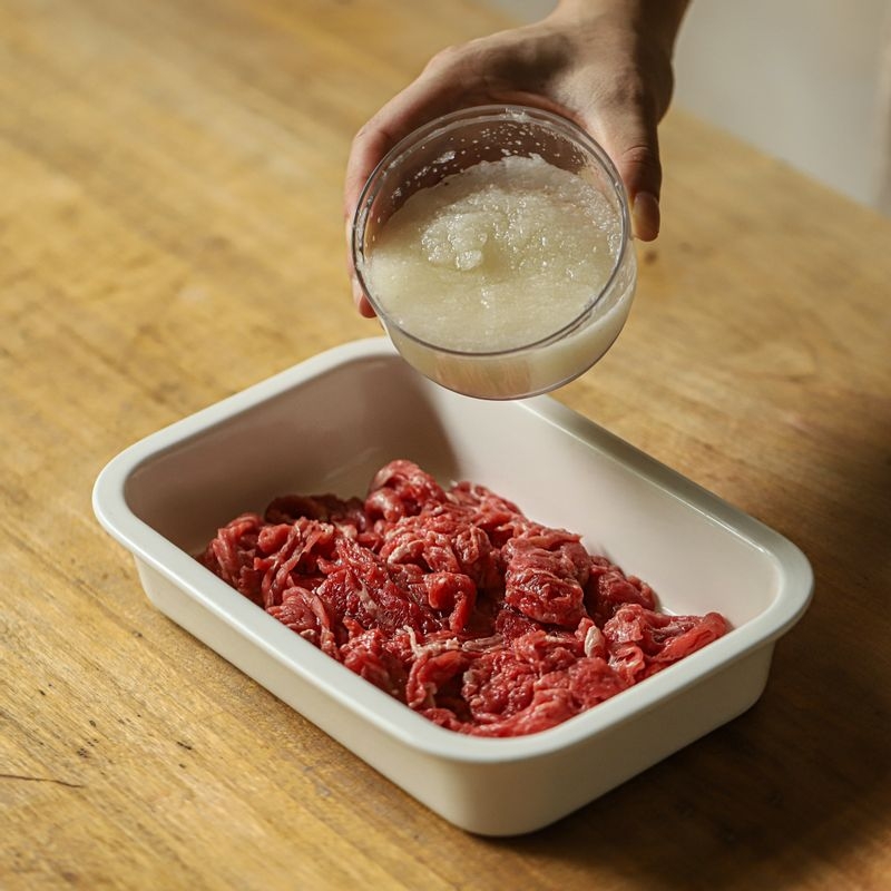 Marinate the beef in the pear juice and seasoning mixture. (Tip: Pear juice helps tenderize the meat.)