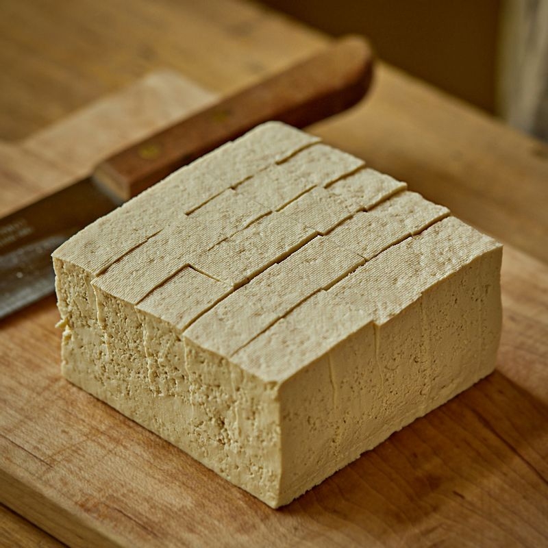 Pat the tofu dry with a cloth, score it with a crosshatch pattern and sprinkle with salt and pepper. Make sure to remove as much moisture as possible for the best texture.