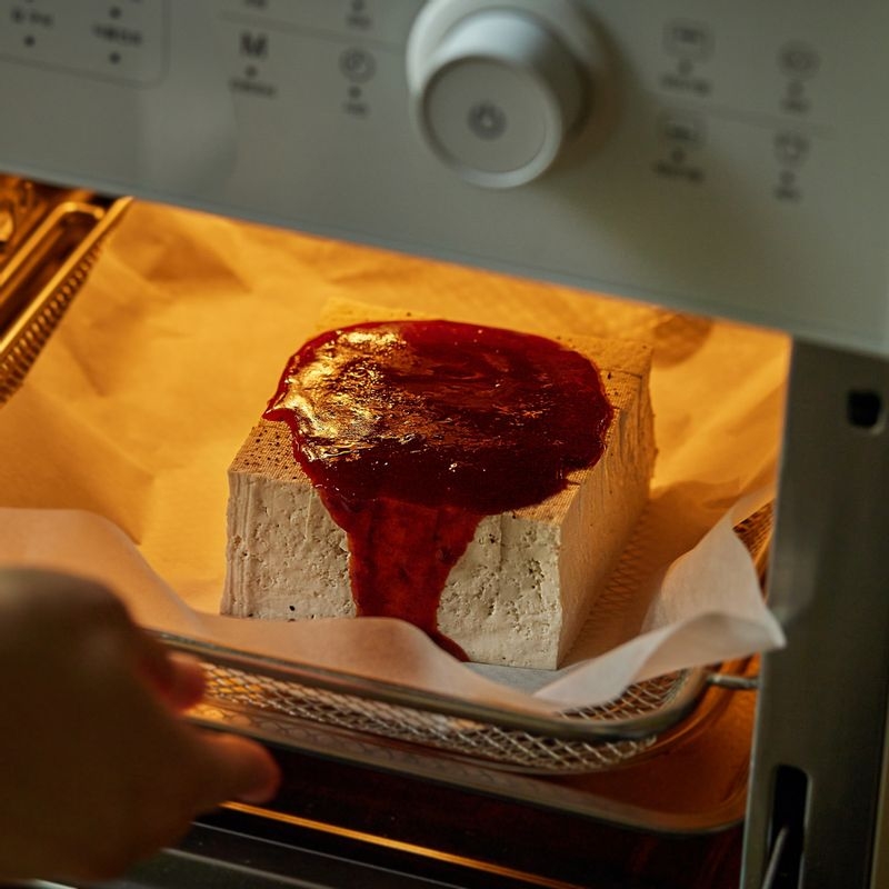 Place the tofu on parchment paper, cover with the seasoning mixture, and grill in an air fryer at 200 degrees Celsius for about 20 minutes.
