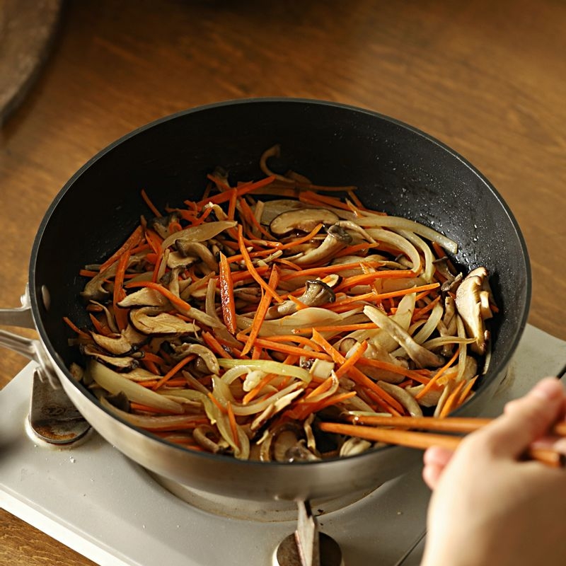 Mix the seasoning ingredients in a bowl. In a heated pan, add oil and stir-fry the onion, carrot and mushrooms with a little salt.