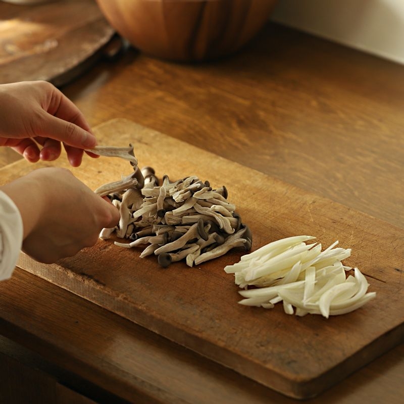 Julienne the carrot, shiitake mushrooms, and onion, and tear the oyster mushrooms along the grain. Cut the chives into 5 cm lengths.