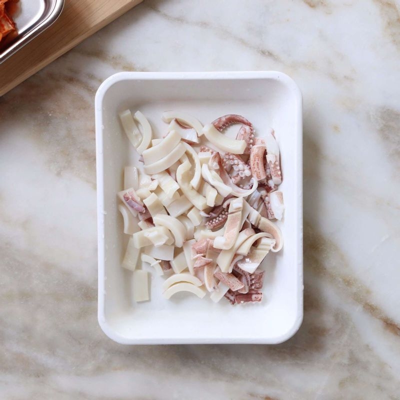 Clean and remove the insides of the squid, then blanch it briefly. Chop the squid into small pieces. (Blanching the squid helps prevent excess moisture from making the batter too runny and also makes the pancakes crispier.)
