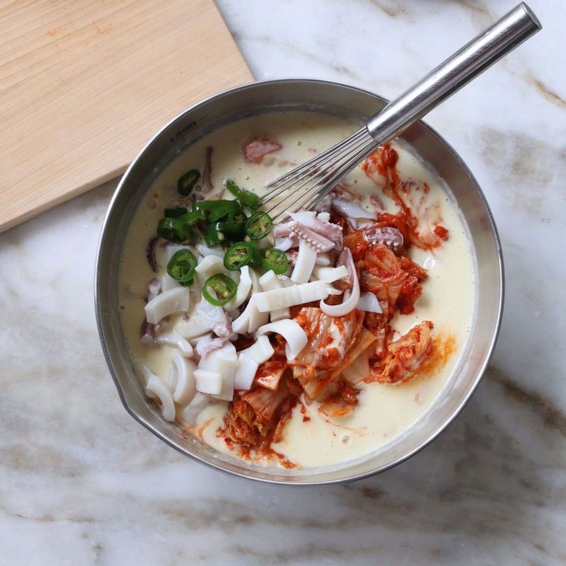 In a mixing bowl, combine the pancake mix, water and egg, stirring until smooth. Add the chopped kimchi, green chile peppers and squid. Mix well. (For a richer color, you can add a pinch of red chile powder to the batter.)