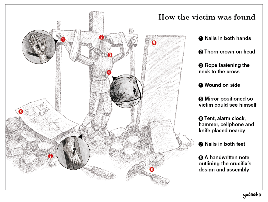 Kim erected the cross and hung two loops of bandages to support his arms, with a structure near the bottom to support his feet to prevent him from falling. He donned the crown of thorns and got on the cross, after which he bent his body to nail both his feet to the cross.