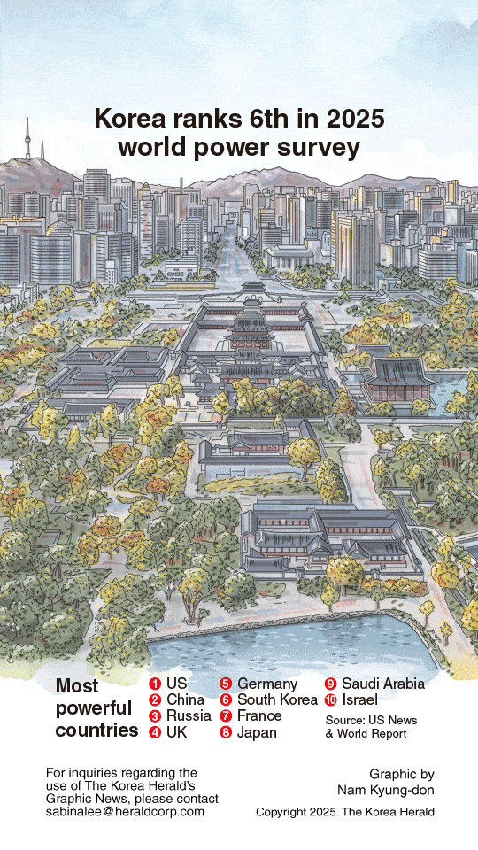 With the United States at the peak of global power thanks to its unmatched economic and military capabilities, South Korea has been ranked sixth in the 2025 world power survey conducted by US News & World Report. The study was carried out in partnership with BAV Group of the WPP network and the Wharton School of the University of Pennsylvania.