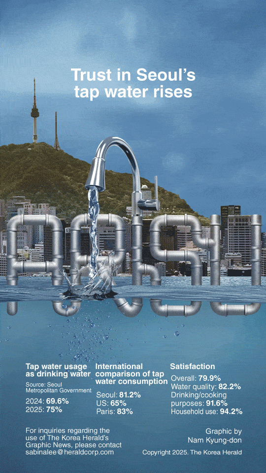 A recent report by the Seoul Metropolitan Government, based on a survey of 1,000 adults, shows growing confidence in Seoul’s tap water, Arisu. Seventy-five percent of respondents now drink tap water, up 5.4 percentage points from last year. Direct household use reached 56.3 percent, while indirect use for coffee, tea and cooking exceeded 63 percent.