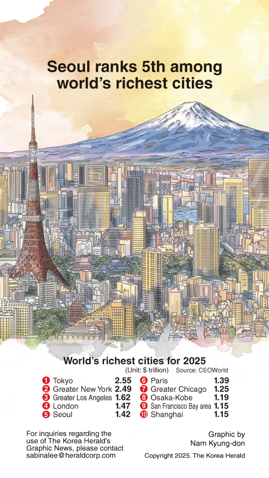 Seoul has ranked fifth among the world’s richest cities for 2025, according to CEOWorld magazine, with Tokyo topping the list at a gross domestic product of $2.55 trillion, narrowly ahead of the New York metropolitan area at $2.49 trillion, based on a survey of 300 major metropolitans worldwide.